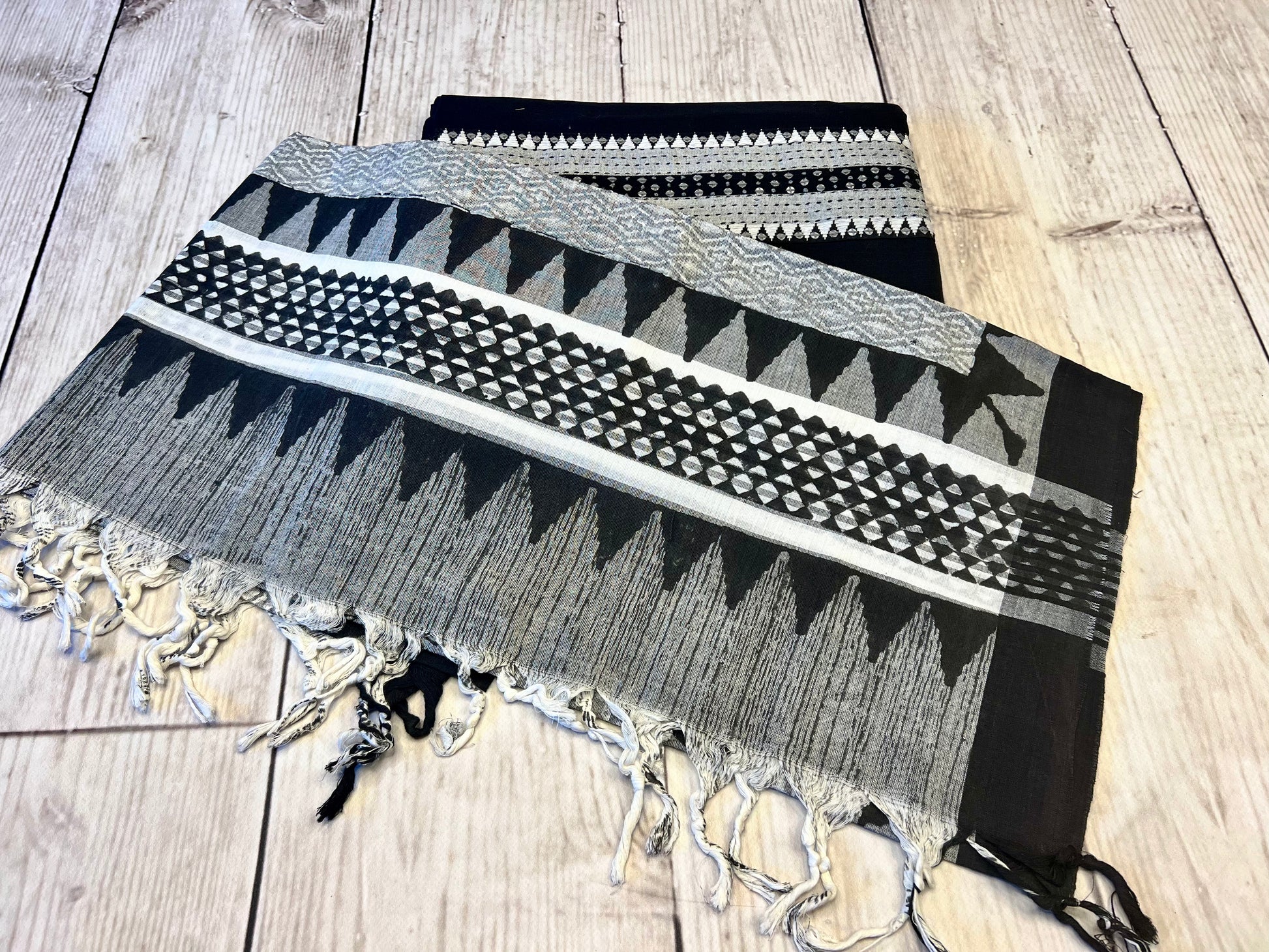 Cotton grey geometric embroidery unstitched kameez with a black and grey thread neckline and a plain grey fabric for bottoms.. This comes with a printed black and grey geometric printed dupatta.