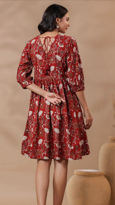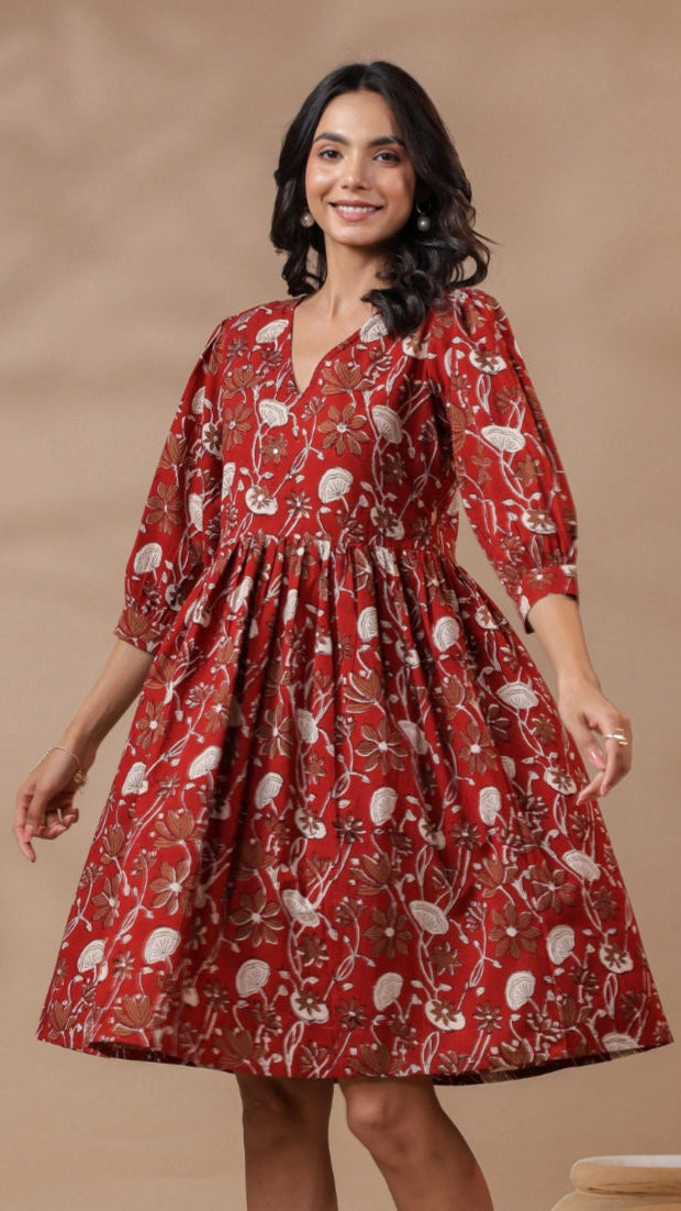 Cotton rust flower block print dress with a v- neckline and pockets.