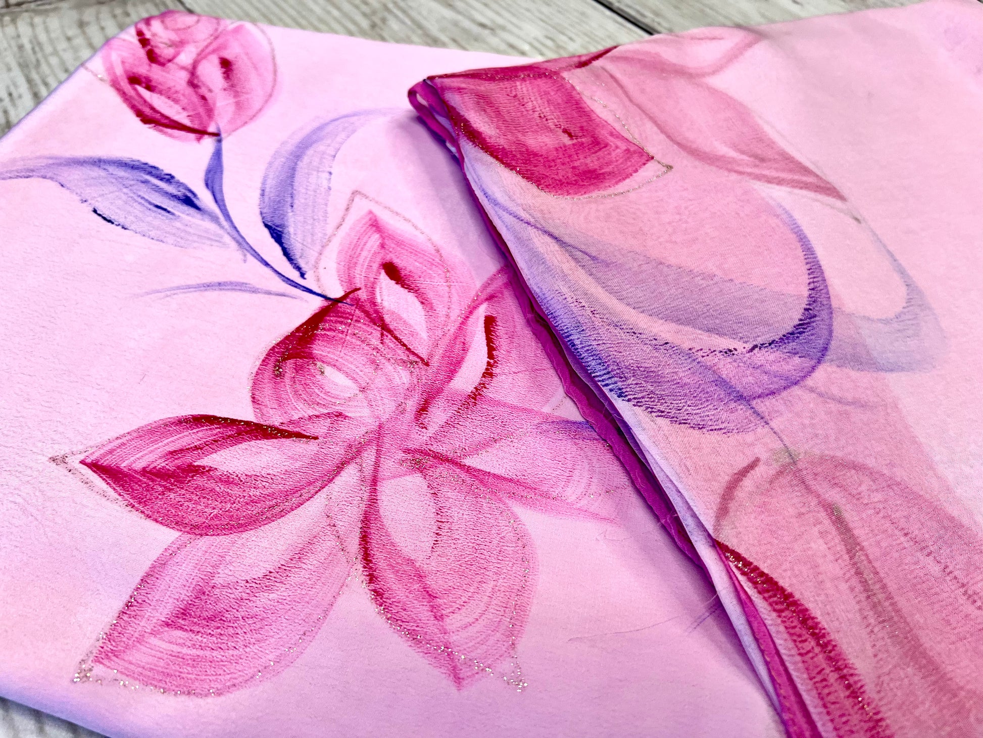 Crepe pink kameez with hand painted flowers in pink with crepe pink plain material for bottoms. This comes with a pink hand painted dupatta.
