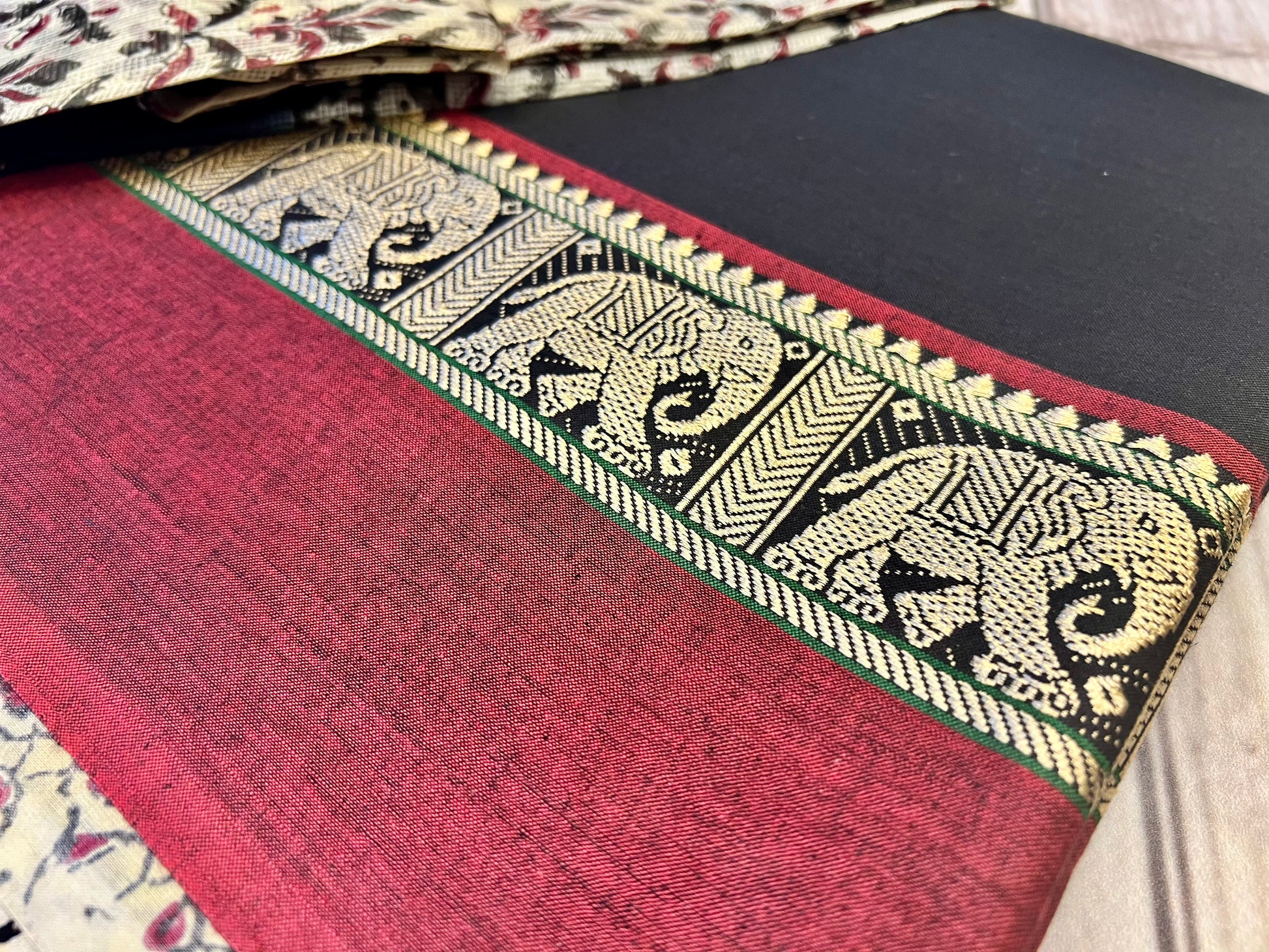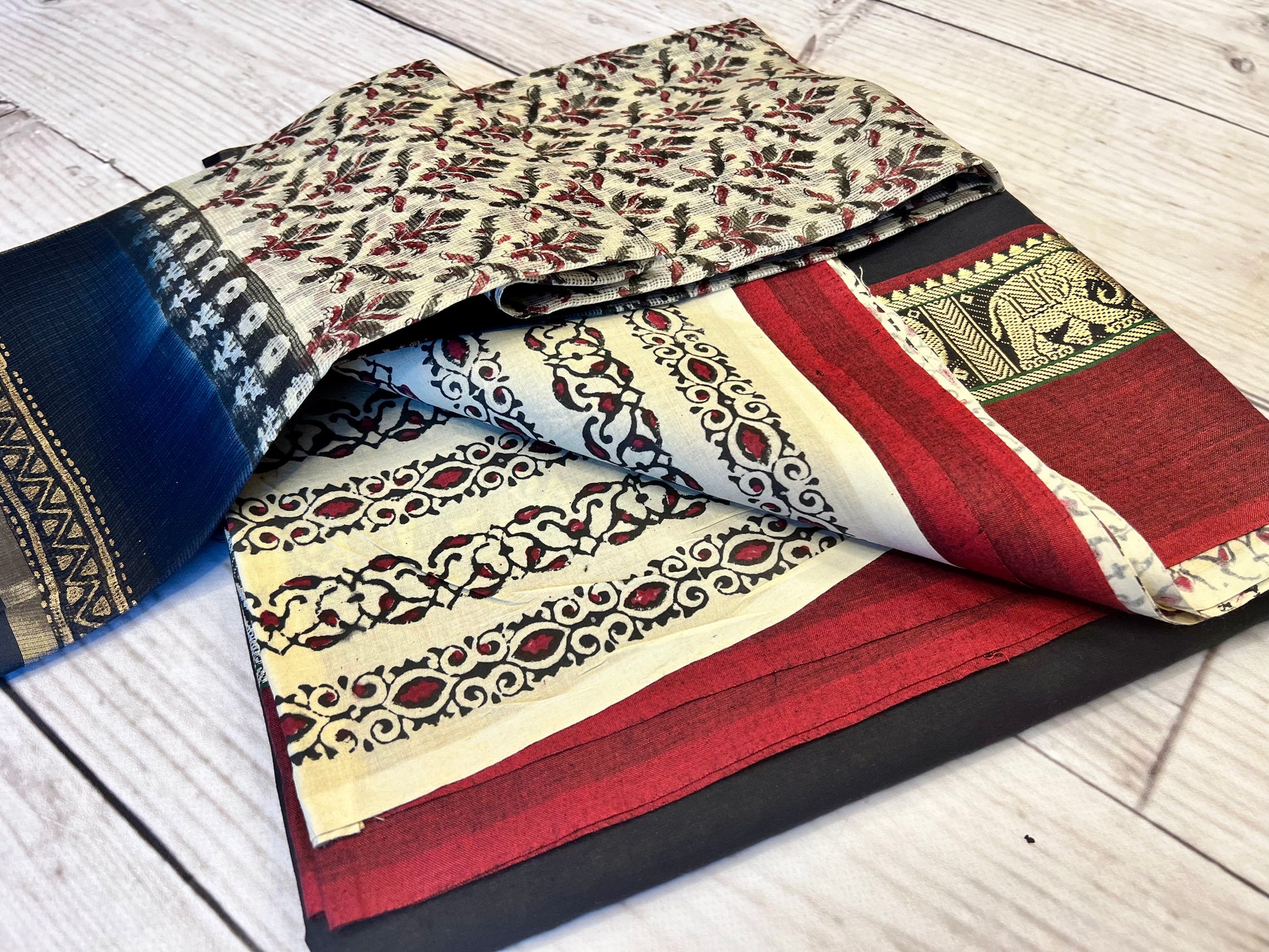 Cotton black unstitched kameez with a gold elephant pati finished with red cotton fabric. This comes with a beige block print cotton fabric for bottoms and a block print dupatta.